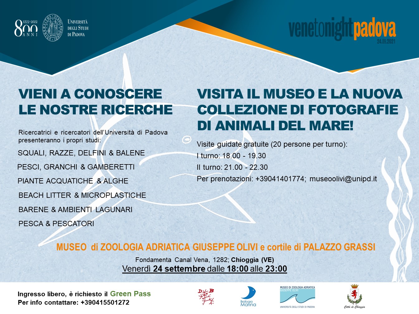 In occasione dell'edizione 2021 di Venetonight, la sera del 24 Settembre sarà possibile visitare il Museo di Zoologia Adriatica "G. Olivi" e la sua nuova collezione di fotografie di animali del mare. Inoltre, presso il cortile di Palazzo Grassi, potrete conoscere da vicino tutte le attività scientifiche della Stazione Idrobiologica di Chioggia.